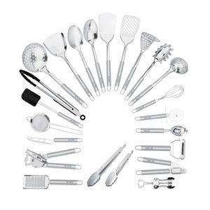 Elevate your cooking experience to a whole new level. Combining functionality, durability, and style, this comprehensive set has everything you need to confidently tackle any recipe. Crafted from high-quality stainless steel, these kitchen tools are designed to withstand the rigors of everyday cooking, thanks to the non-scratch and heat-resistant properties of these utensils. With this premium set, you'll be equipped to take on any culinary challenge with confidence.