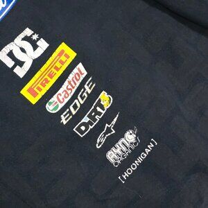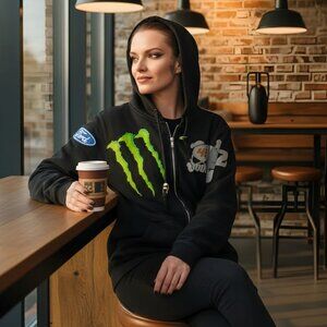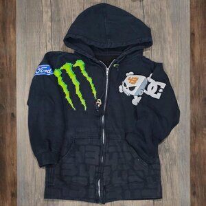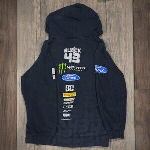 Step into the legacy of Ken Block w/ this full‑zip hoodie, designed in black w/ bold graphics from Monster Energy, Ford & DC.