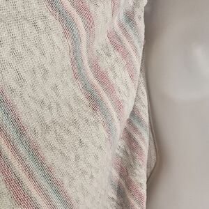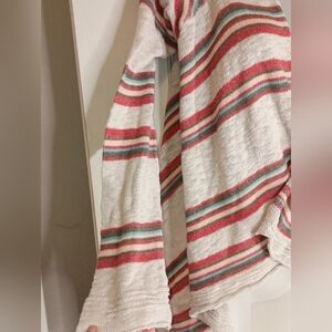 cozy cardigan that features a pattern of horizontal stripes in red, peach,blue,green and cream white colors. The fabric is Knitted giving it a warm and textured feel. It has a loose, casual fit with an open front, making it easy to layer over other clothing. The edges of the cardigan are slightly frayed, adding to its relaxed and worn-in look.
