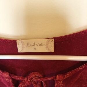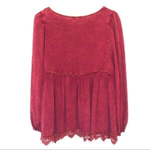 altar’d state top, boho blouse, red boho top, pink boho blouse, flowy boho top, festival top, peasant blouse, long sleeve boho, crochet hem top, lace trim blouse, bohemian style top, casual boho outfit, fall blouse, spring blouse, lightweight top, romantic style top, cottagecore blouse, tie neck blouse, altar’d state boho, xs boho top, everyday casual top, soft wash blouse