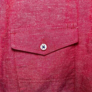 Classic, red collared shirt with white buttons, 2 flap pockets at chest.