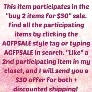 💖 BUNDLE THIS ITEM WITH ANOTHER 2/$30 ITEM IN MY CLOSET, AND I WILL SEND YOU A $30 OFFER ON BOTH! There are hundreds of participating items to choose from. To find these items, type AGFPSALE in the search bar on Poshmark or click the AGFPSALE style tag on this listing!