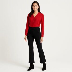 black flared pants, ebony trousers, jet black slacks, smooth stretch knit, structured fit, sleek silhouette, professional office wear, business casual, classic minimalist style, modern tailored look, chic and sophisticated, timeless wardrobe staple, versatile everyday wear, elegant and trendy, fall winter essential, polished and refined