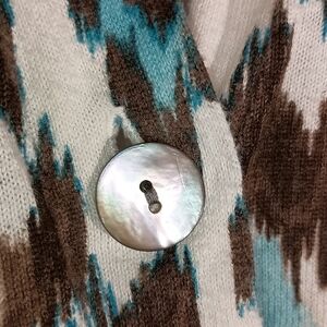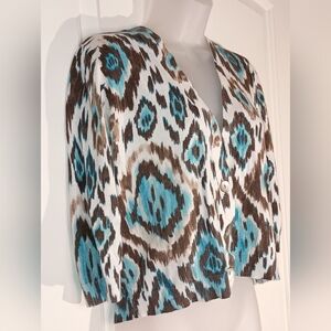 Stylish cardigan with a vibrant ikat pattern. Features a button-up front. Perfect for layering.Has a vibrant and bold pattern. This top features a mix of colors including white, brown, and various shades of blue. The pattern consists of abstract, geometric shapes that resemble ikat or tribal designs. The top has a button-down front with three visible buttons, which are white and brown in color. The fabric is lightweight. The sleeves are 3/4 long and have a fitted cuff at the end.