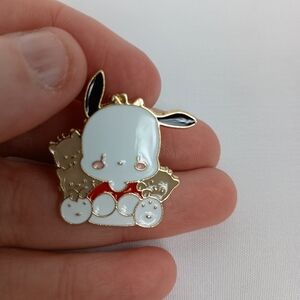 Adorable Pochocco enamel pin with black, white, and red details. Perfect for accessorizing bags or jackets.
