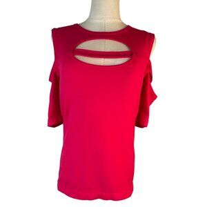 Fabletics top, cold shoulder, cutout neckline, nylon elastane blend, bubblegum pink, women's medium, trendy top, stretchy shirt, breathable fabric, lightweight top, casual chic, women's fashion, summer top, sexy, Low cut, Scoop neckline