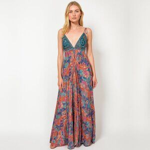 maxi dress, sleeveless, spaghetti strap, turquoise, coral, orange, pink, teal, paisley, bohemian print, intricate pattern, silky fabric, lightweight material, flowy silhouette, relaxed fit, summer party, beachwear, festival outfit, resort style, boho chic, artistic, vibrant, colorful, elegant, feminine, trendy, eye-catching, exotic