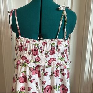 Embrace a relaxed vibe with this Forever 21 sundress, featuring a sleeveless design and elegant spaghetti straps. The cream color with pink floral accents complements its playful mini length, making it perfect for casual or resort wear. Its A-line silhouette offers a flattering fit, ideal for sunny days. Linen and Rayon Blend. Inner lining. Ties at the front bust. Side zipper and clasp.