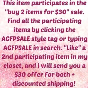 💖 BUNDLE THIS ITEM WITH ANOTHER 2/$30 ITEM IN MY CLOSET, AND I WILL SEND YOU A $30 OFFER ON BOTH! There are hundreds of participating items to choose from. To find these items, type AGFPSALE in the search bar on Poshmark or click the AGFPSALE style tag on this listing!