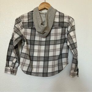 Bixby Nomad button down cotton flannel shacket with hood. Plaid white, grey, tan design. Front full length buttons. Front pockets. Cotton grey hood. Size 8-10 Medium girls. Worn only once. Excellent worn condition!