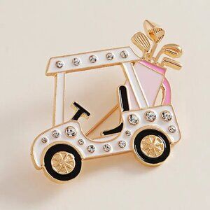 NEW stylish golf-themed accessory set featuring a rhinestone golf cart brooch and two pairs of matching earrings. A charming gift for golf enthusiasts. Golf brooch, golf earrings, rhinestone jewelry, adorable, golf gift, gold-tone brooch, enamel brooch, sports jewelry, pink golf set, golf accessories, themed jewelry, golf cart pin, stylish brooch, unique gift