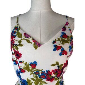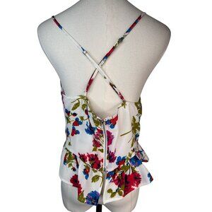 NWT The floral peplum top features a vibrant design with a flattering V-neck and spaghetti straps. Ideal for warm weather, offering a stylish look. Fabric feels like crepe.