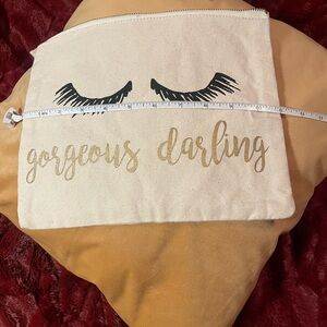 Carry all your make-up necessities in this Canvas unlined bag. Same on both sides in cursive writing “gorgeous darling”. Statement to uplift and inspire you.