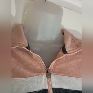 keywords:Women's Jacket,Zip-up Jacket,Colorblock Jacket,Casual Wear,Fashion Apparel,Pink Jacket,Gray Jacket,XS Jacket,Trendy Outerwear,Women's Fashion,Long Sleeve Jacket,Stylish Jacket,Layering Piece,Athleisure Wear,stripes,casual, colorful,cozy, butterly pink