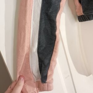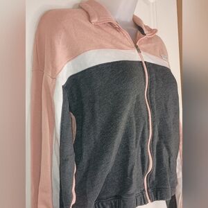 keywords:Women's Jacket,Zip-up Jacket,Colorblock Jacket,Casual Wear,Fashion Apparel,Pink Jacket,Gray Jacket,XS Jacket,Trendy Outerwear,Women's Fashion,Long Sleeve Jacket,Stylish Jacket,Layering Piece,Athleisure Wear,stripes,casual, colorful,cozy, butterly pink