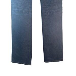 Crafted with a blend of cotton and elasterell, these jeans offer comfort and flexibility. The classic 5-pocket design provides functionality and style. Straight leg, slight flare, darker blue wash.