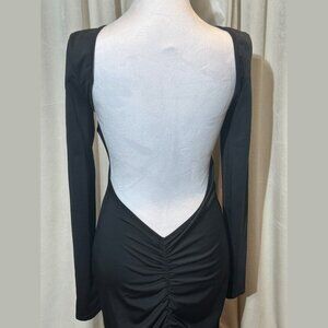 2/30 Long-Sleeve Backless Bodycon Maxi Dress – Black, Stretch , Ruched - M