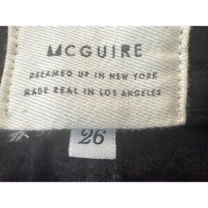 These McGuire skinny jeans, crafted primarily from cotton, offer a sleek, contemporary look. Their high-rise design ensures a flattering fit for a variety of body types. womens black jeans, high rise denim, skinny fit pants, McGuire jeans, size 26, cotton blend, made in USA, machine washable, stylish womenswear, black skinny, denim apparel, casual fashion, wardrobe essential McGuire is a denim brand known for its handcrafted jeans made in Los Angeles, California. The brand's designs are inspired by Parisian fashion and 1990s supermodels, with a contemporary New York City edge