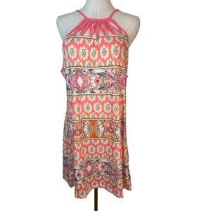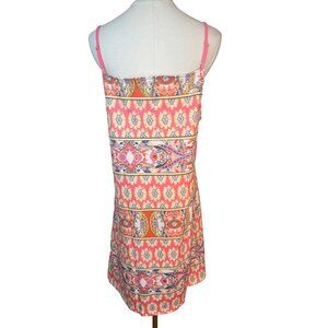 This sleeveless dress features a vibrant geometric print in a combination of pink and yellow hues. Crafted from a comfortable polyester and spandex blend, it offers a flattering fit with its stretchy fabric. Ideal for warm weather, this dress is an eye-catching addition to any wardrobe.