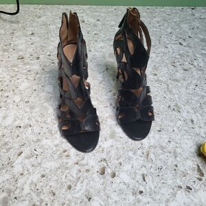 Sharp sandals made of leather. Zip details in back. Heel is 3.5 inches