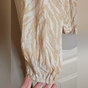 light-colored blouse with a beige and white abstract pattern. The blouse is made of a lightweight fabric and has long sleeves. The pattern on the blouse resembles a zebra print but in a more abstract and less defined manner. There are no visible buttons or zippers, suggesting it might be a pullover style. The blouse has a loose and flowy fit, which could make it comfortable for casual wear.