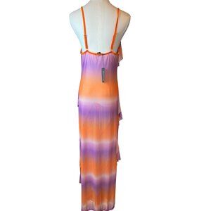 NWT This mesh stretchy eye-catching gradient size 8 maxi dress by PrettyLittleThing features vibrant orange and purple hues. The ruffle details add a playful touch, while its adjustable straps ensure a comfortable fit.