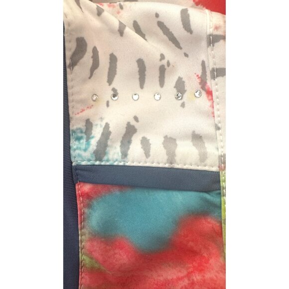 This vibrant women's golf shirt by SwingDish is designed with comfort and performance in mind. It features UV protection and a breathable fabric blend, ensuring a comfortable fit with two-way stretch. Its eye-catching pattern, Swarovski crystals on the shoulders, and a convenient collar design add style to your golf wardrobe.