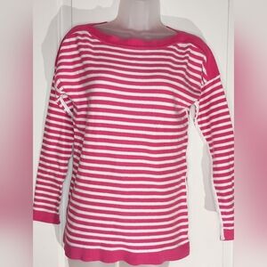 a long-sleeved shirt with a pattern of horizontal stripes.Boat neck style The stripes alternate between white and a bright pink color. soft and comfortable.Has a white stripe going down on both sides and border of the arms.The sleeves and the bottom hem of the shirt have a solid pink band, adding a contrasting detail to the striped pattern. Not super light or too heavy.