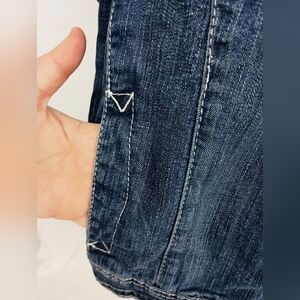 This blue denim jacket is just cool and laid-back. It's got a button-up front with six metallic buttons and two chest pockets that have flap and button closures. The white stitching and small sequins on the pockets give it a fun touch. The seams and stitching give it that rugged, casual vibe. The fabric's medium-weight denim, making it perfect for everyday wear. It also has a collar and long sleeves with stitching details on the cuffs and hem.