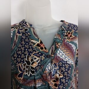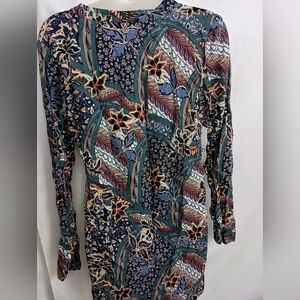 Stylish long sleeve dress with a vibrant multicolor pattern. Features a mix of vibrant blue, green, and brown tones.