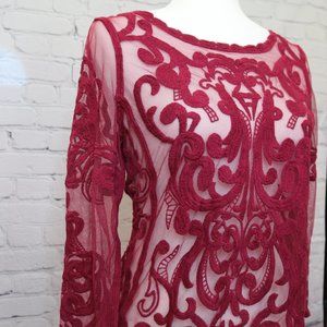 Here is a darling dark red embossed, embroidered lacy top from Express. Size small. In good condition only lightly worn. The size chart from Express is included. Don't hesitate to reach out with any questions! This is the perfect blouse for date night or going out with the girls!