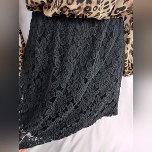The bottom part is made of black lace with an intricate floral pattern, layered to add texture and depth to the skirt. The contrast between the daring leopard print and the intricate black lace makes this dress a unique statement piece.
