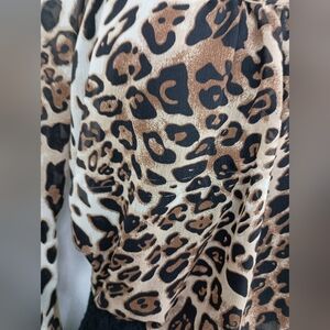 This dress is a captivating blend of bold and delicate elements. The top part showcases a leopard print design in shades of brown, black, and beige. This section includes sheer, lightweight long sleeves that add an airy feel.