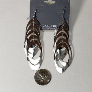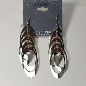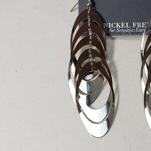 These elegant earrings feature a 3.5-inch drop length and fishhook backings. They are versatile, stylish, and perfect for any occasion. Add a touch of sophistication to your jewelry collection with these stunning silver-tone earrings. NWT