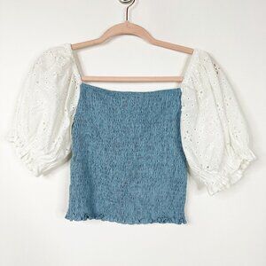 2/$30 Strut & Bolt Smocked Puff Sleeve Cropped Blouse Blue White #A0529 TRB3