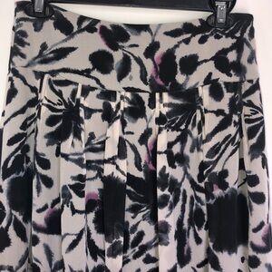 Elegant and feminine A-line skirt from The Limited featuring a distinctive floral print in tan, black, and hints of purple. Designed with a wide waistband, pleated front, and a gently flared silhouette that flatters the figure.