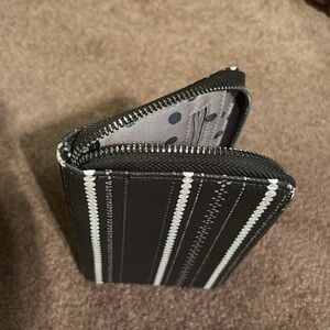 Zip around wristlet with 4 card slots, 1 ID slot, 1 zipper compartment and 1 billfold compartment