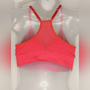 This sports bra features a mesh design on the upper part, providing breathability. The bra has thin adjustable straps and is made of a stretchy, comfortable material.