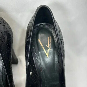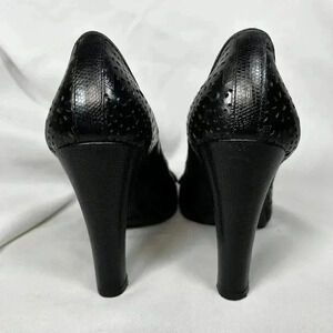 Vince Camuto Size 8.5/38 1/2 Loafer Heels Fringe Black Croc Embossed Preppy