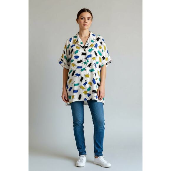 Vintage Top Size S Janine Pauporte Button Down V Neck Collar Art to Wear France