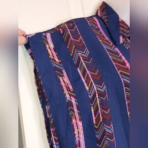 This western style sheer blouse is predominantly blue with horizontal stripes featuring intricate, colorful zigzag patterns in shades of pink, red, green, and white. The shirt has a button-down front with dark buttons and a collar. The design is vibrant and eye-catching, making it interesting due to its detailed and colorful pattern.