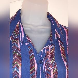 keywords:buttons, collar, vneck,sheer,aztek,stripes,stripes, colorful, patterned, casual,business