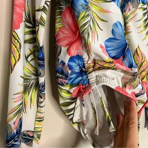 Long Sleeve swimsuit with tropical floral design, side ties, front zipper