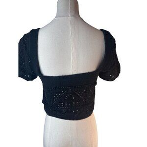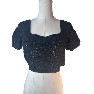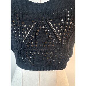 This black cropped sweater top by Zara features a stylish open-knit pattern. Crafted from a cotton and polyester blend, it offers a comfortable fit. cropped sweater, Zara top, black knit, open knit, short sleeve, cotton blend, polyester mix, small size, trendy fashion, stylish top, square neckline, openwork design