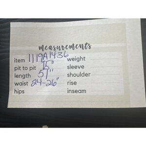 Excellent pre-owned condition. Measurements: Pit to pit = 15", Length = 51", Waist = 24-26".