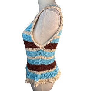 Zara knit top, sleeveless top, striped knit, women's fashion, casual top, trendy top, cotton blend top, ruffle hem, medium size top, blue and brown, comfortable wear, Zara clothing, chic style, resort, cruise wear, vacation, caribbean, boating, adventure, round neckline, unique, knitted