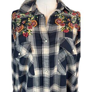 This stylish shirt jacket combines a classic plaid navy and beige pattern with vibrant floral bead embroidery. The longline design and snap buttons offer versatility. Stunning colorful beadwork flanks both sides of the shirt's top. It appears to be a tad oversized.