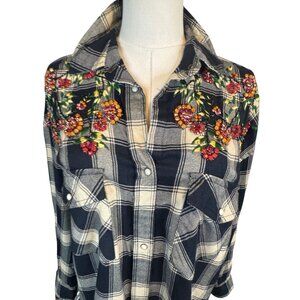 2/$30 ZARA S Plaid Navy Blue Longline Shirt Jacket Floral Beading & Snaps