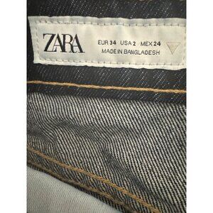 Like new, in pre-owned condition, with no flaws.women's shorts, denim shorts, high-waisted, casual wear, Zara shorts, summer fashion, blue denim, five-pocket, button closure, zipper fly, cotton fabric, size 2 shorts, dark blue, beach, vacation, work shorts, packable, traveling, like new