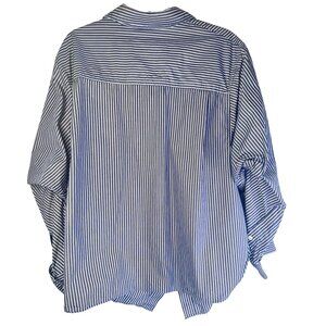 This striped button-up shirt from Zara combines style and comfort. Made from 100% cotton, it's breathable and perfect for daily wear. striped shirt, Zara button-up, cotton blouse, navy and white, women's fashion, casual wear, office style, breathable top, small size, long sleeves, chic stripes, classic design, versatile piece